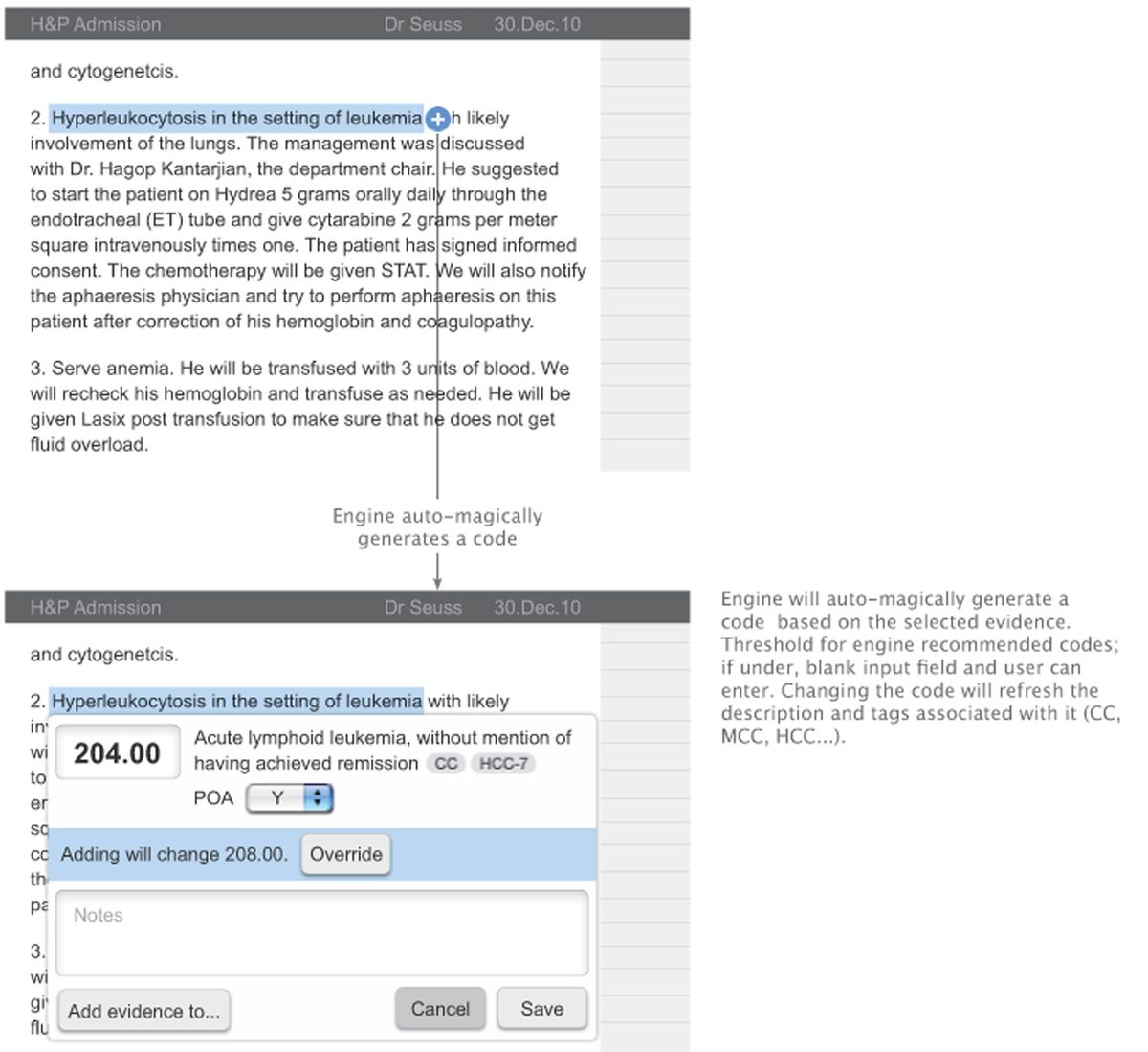 GoInvo partnered with CodeRyte to transform a powerful but “bolted-on” engine into a complete product that hospitals could rely on every day. User research made the trust problem clear: billing managers and coders did not just want correct codes; they wanted to see how the AI got there. They needed to audit specific phrases in the note, review confidence levels, and quickly spot where human intervention was still required.